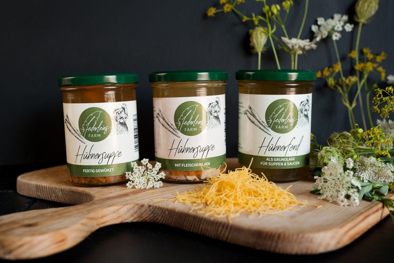 Unsere leckere, fertig gewürzte Hühnersuppe ist pur und mit Fleischeinlage erhältlich, ein Geheimtipp besonders in der Erkältungszeit. Unser Hühnerfond ist die perfekte Grundlage für köstlich Suppen und Saucen.