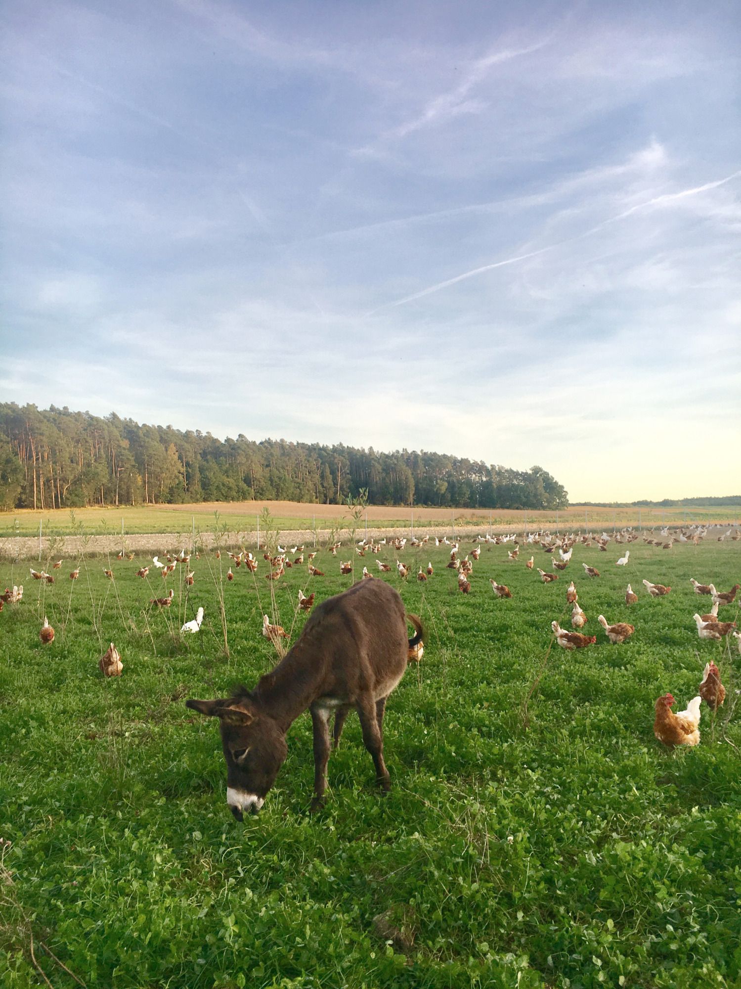 Unsere Legehennen mit ihren Hähnen leben ein glückliches Hühnerdasein am Waldrand inmitten unserer Wiesen und Feldern – tagsüber in ihrem riesigen Auslauf, bewacht von unseren Eseln Paul und Jaqueline, nachts in unserem nagelneuen modernen Stall.